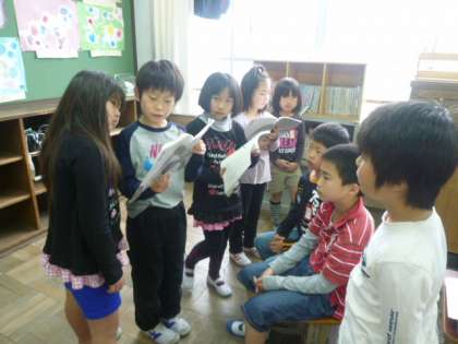 音読発表会に向けて、事前にペアの班の音読を聞きあいこし、リハーサルとして練習しました。くふうしたほうがよいところ、よかったところなどを評価カードに書いて手渡ししました。