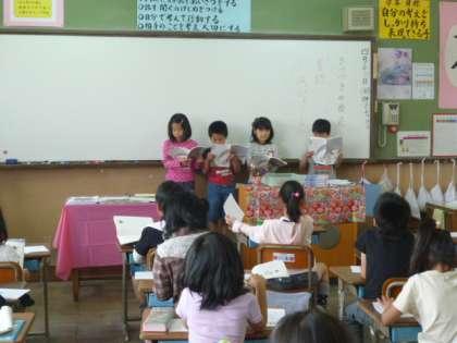 国語で、「きつつきの商売」の長い物語を学習したまとめとして、音読発表会を開きました。