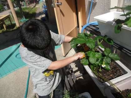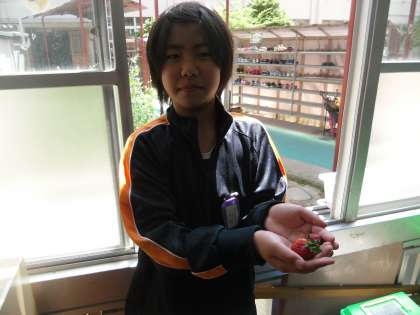 土日の雨と好天に恵まれたのか、朝、見るといちごが色づいていました。