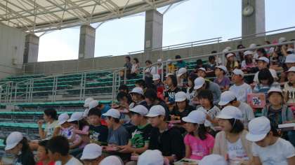 イルカプールの前で4組さんも楽しくお弁当タイムです。おむすびイルカ?