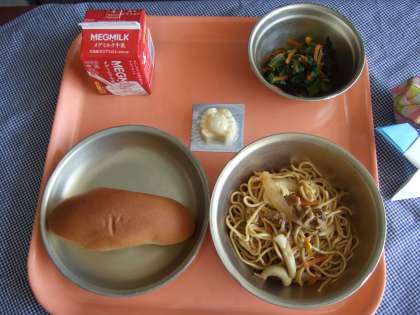「ソース焼きそば」は、子どもたちに人気の献立です。 豚肉・いか・キャベツ・たまねぎ・にんじんを炒め、茹でた中華乾麺をあわせて仕上げました。