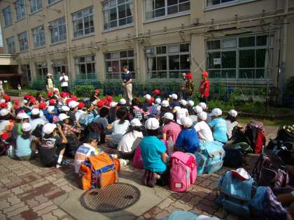 おはようございます。雨もすっかり上がりました。中庭で出発式を終え,4年生70人全員がバスに向けて出発しました。これからの様子は,みさきの家からホームページでお知らせします。みさきの家でたくさんの思い出作りをして,元気に帰ってきてほしいです。いってらっしゃい。