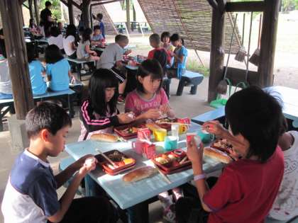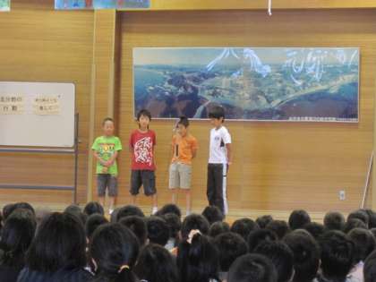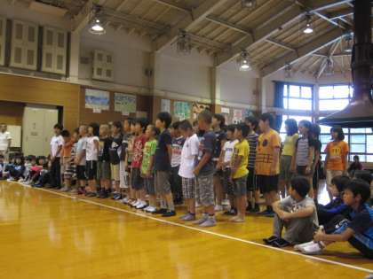 今日の朝,天候は曇り,気温26度前後です。子どもたちは,6時に全員起床。朝の集い(梅津北・川岡・衣笠小3校)では,お互いに校歌を歌い,代表の子どもたちによる学校紹介を行いました。その後,朝食を食べて,宮崎浜での磯観察に出発予定です。全員元気で出発の用意をしています。