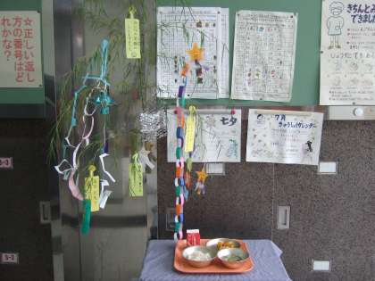 七夕の行事献立です。 給食室のホールも楽しい雰囲気になるように、七夕飾りを作りました。 「七夕そうめん」は、オクラを星に、そうめんを天の川に見立てています。 だし昆布・けずりぶし・干ししいたけの戻し汁で、だしをとりました。 子どもたちに、人気でした。