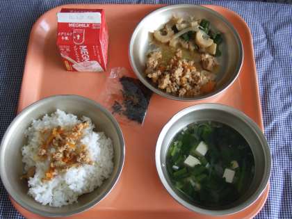 とりそぼろ丼 牛乳 伏見とうがらしとじゃこのいため煮 すまし汁