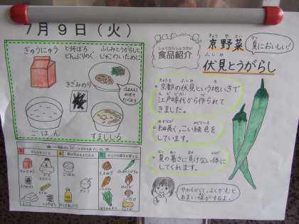 京都府産の伏見とうがらしを使用した1年に1度の献立です。 すまし汁の具は、とうふ・ほうれん草・みょうがでした。 とりそぼろ丼は、鶏ひき肉・たまねぎ・にんじん・しいたけ・しょうがを甘辛く味付けし、各自でごはんの上にのせ、きざみのりをかけて食べます。 子どもたちに大人気で、ごはんも大変良く食べてくれました。