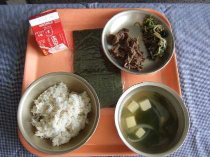 「セルフのりまき(肉・ナムル)」は、韓国風ののりまきで、日本ののりまきと見た目は似てますが、具や味に違いがあります。 「肉」は、ごま油で生姜を炒め、肉を入れ、砂糖・みそ・料理酒・みりん・しょうゆで味付けしました。 「ナムル」は、ごま油で小松菜・もやしを炒め、コチュジャン・しょうゆで味付けし、いりごまを入れました。 「自分で作ったのりまきは、おいしかった」と5年生の男の子が感想を言ってくれました。 残菜は、おかずもごはんも少なかったです。