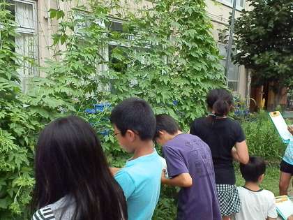 暑くなって,みんなで育てているツルレイシがぐんぐん成長しています。