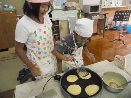 できたホットケーキのうちの一つ、「なんかカメの足みたいなんがついてるわ。カメホットケーキや!!」と大喜びしていました。
