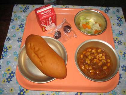 本日の献立は味つけコッペパン・牛乳・チリコンカーン・野菜のホットマリネ・ぶどうです。