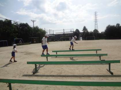 体育の時間に,平均台あそびをしました。はじめは自信のなかった子も、だんだん上手に乗れるようになりました。