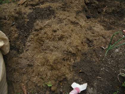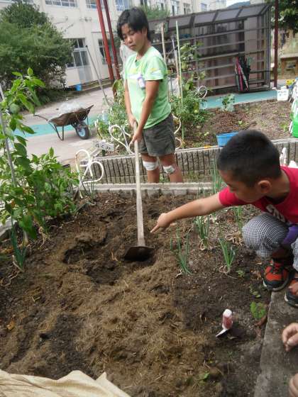 ナスをぬいた後、動物園からいただいたゾウの糞から作られたという土を畑に混ぜ込みました。ちょっと臭いました。