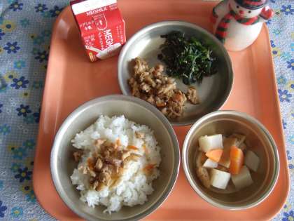ごはん 牛乳 とりめしの具 ほうれん草とじゃこのいためもの かぶらとおあげのたいたん