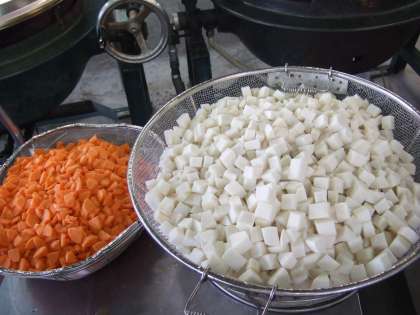 「かぶらとおあげのたいたん」は、新献立です。 「たいたん」とは京ことばのひとつで「煮物・たいたもの」という意味があります。 冬においしいかぶらと、おあげ(油あげ)と人参を、出し昆布とけずりぶしでとっただしでたきました。 聖護院かぶらを使用しました。