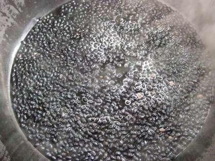 お正月料理でおなじみの黒豆は、黒大豆ともよばれる大豆の仲間で、体をつくるたんぱく質が多く含まれています。 黒色はアントシアニンという色素によるものです。 本日の給食の黒豆は、北海道産を使用しました。