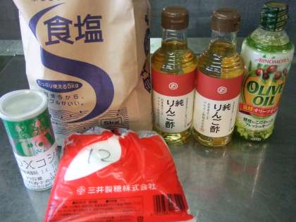 給食では、献立によって酢を使い分けています。 米酢は、紅白なます・ごま酢煮・さばのかわり煮などに使用しています。 穀物酢は、ごぼうのソテーで、ごぼうのあく抜きに使っています。 本日の野菜のホットマリネには、りんご酢を使っています。 りんご酢は、まろやかな酸味が特徴です。 キャベツ・にんじん・じゃがいもを蒸してから、オリーブオイルで炒め、りんご酢・さとう・しお・こしょうを合わせた調味液で味付けました。