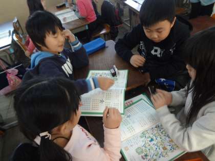 今日は,2年1組では九九すごろくをしました。九九をしっかりおぼえていないとできないゲームです。九九を友だちといいながら,楽しくすごろくをしました。