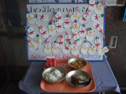 本日の給食は、節分の行事献立です。 「いわし」は、舞鶴港で水揚げされたいわしを、しょうがと共に、三温糖・料理酒・しょうゆで煮つけました。