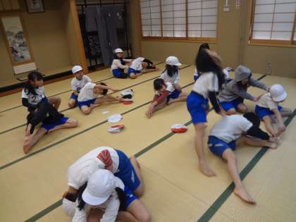 今日2年1組では,体育の時間にワールドルームでじゅうなん体操をしました。音楽をながしながら体のあちこちの筋を伸ばしていきました。みんな、リズムはとれてダンスも踊れるのですが,柔軟体操になると体がかたい、かたい・・・