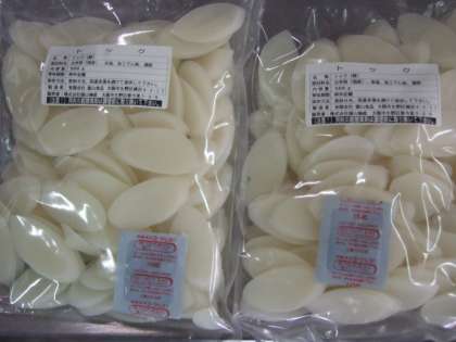 本日の「わかめスープ」に、トックを使用しました。 トックは、韓国・朝鮮伝統の薄切りにしたおもちです。 日本でごはんとして食べている、うるち米というお米からできています。 日本のおもちと違い、のびないのが特徴です。 子どもたちにも、人気です。