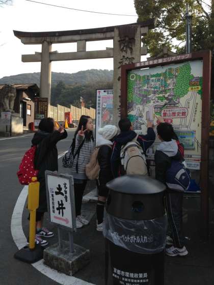 霊山護国神社の入り口、神社内の坂本龍馬、中岡慎太郎の像です。神社内からは、京都市内が一望できました。寒さにまけず、元気いっぱいです。