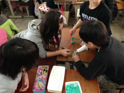 今日は,ストローと粘土玉を使って箱の形を作りました。グループで試行錯誤・・・。出来上がると,粘土玉を頂点の数,ストローを辺の数と見て,みんなで確かめあっていました。体験的に,視覚的にとらえることができ,箱の形の理解につながったようです。