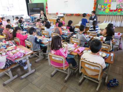 6年生に手伝ってもらいながら,給食当番が初めての給食の用意をしました。