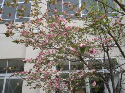 暖かくなり、半袖の子どもたちが増えています。校内の草木も美しい花を咲かせています。さて、この花は、どこに咲いているでしょう?