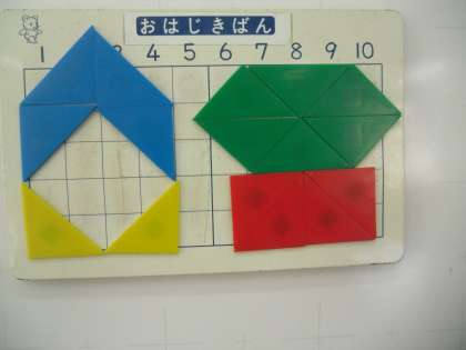 4色の三角形を使って見本と同じ形を作っています。あっち向けたりこっち向けたり、回転させたりしています。斜辺とそうでない辺の違いがわかってからは手馴れてきて、素早く作れるようになりました。