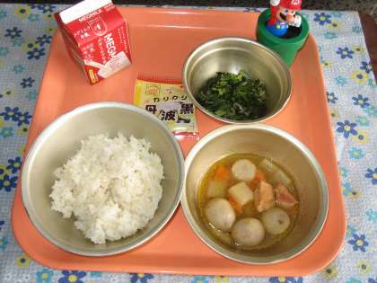 麦ごはん・牛乳・鶏肉と里いもの煮つけ・ほうれん草とじゃこのいためもの・黒大豆