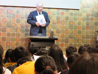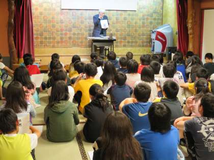 宿舎で,夜,絵本「ぞうれっしゃがやってきた」の作者,小出先生のお話を聞いているところです。途中で歌を歌われたり,ハーモニカを吹かれたりと,うまく子どもたちを引きつけるように話していただきました。