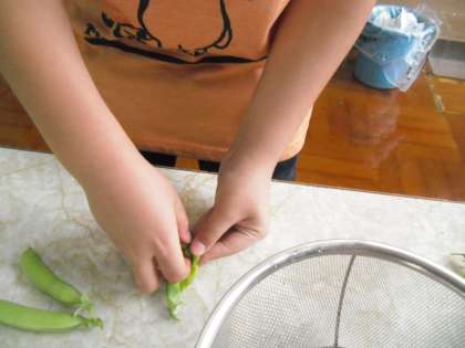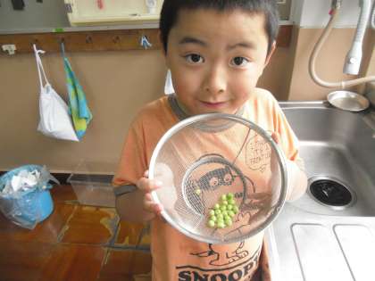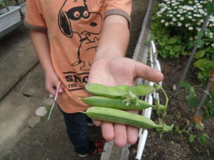 えんどう豆を収穫しました。さやから取り出すとパチンパチンと勢いよく飛び出します。生きているようでした。きれいな緑色でした。