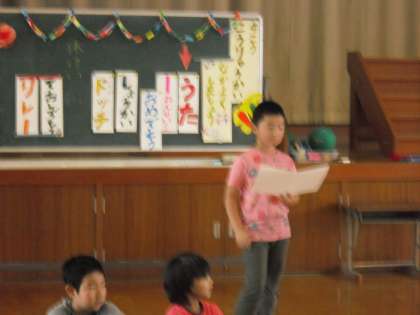 Iさんが司会をしてくれました。「え〜!!僕が一人でやるの?!」と不安そうでしたが、「あなたしかいないでしょ!!」の担任からのいつもの指示で、音読宿題をがんばりました。当日は昨年度6年生の声リーダーTさんのようにしっかり進行できました。さすが!!