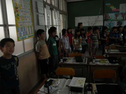 教科書を見て硯や筆などを同じように机上に用意します。できたら教室の後ろに行きます。準備の仕方のきまりを聞いているところです。