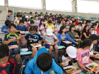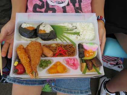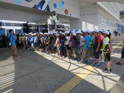 名古屋港水族館入口の写真です。その下は,イルカショーが見られるメインプールのスタンドで食べた弁当です。「天むす」が入った上等の弁当でした。