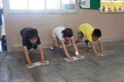 みんなで声を掛け合ってぞうきんがけも頑張っています。