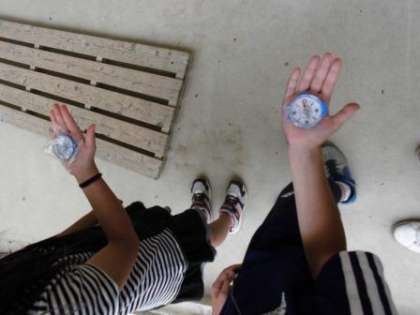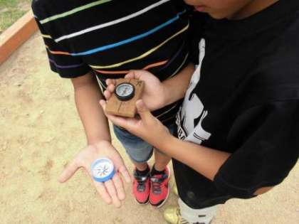 子どもたちは,初めて使う方位磁針に興味津々で,