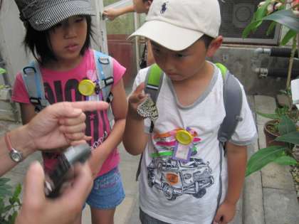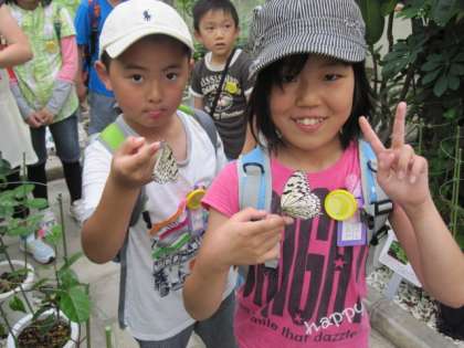 「わたしもIさんみたいに指に止まってほしい!!」と指をチョウに向けて差し出すNさんです。なかなか止まってくれずちょっとあきらめかけていたのですが、じっとしていると止まりにきてくれました。「やったぁ!!」