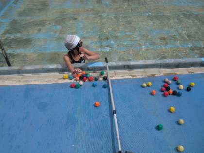 ちょっと肌寒かったのですが、入りました。朝のかけあしで思い切り汗をかいてプールに直行。初めはよかったのですがだんだんと寒くなってきて少し早い目にあがりました。今日は二人で碁石拾い競争をしました。1回戦36:33でNさんの勝ち。2回戦34:34で同点でした。「あれ?1個足りないではありませんか!」もう一回探せぇ!とばかりに水の中を這うように探していました。なんとすぐ近くにありました。