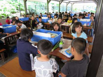 班ごとに,炊事用具と食材をテーブルに用意しました。