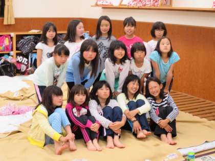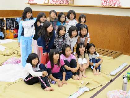 女子は60畳で寝ました。カメラマンに写真を撮ってもらっているところです。