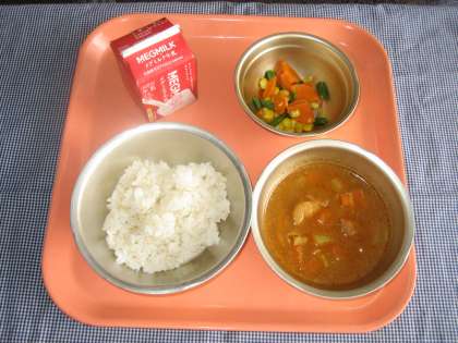 給食では、牛乳が毎日ついています。今日のカレーには、脱脂粉乳・チーズ・ヨーグルトを使っています。
