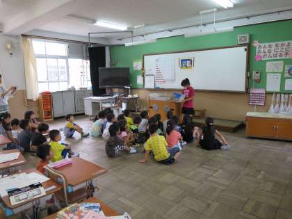 今日は「あじさい読書週間」の最終日です。朝の時間に,図書委員会のメンバーが,4組と1・2年の教室に読み聞かせに行きました。(パート1)