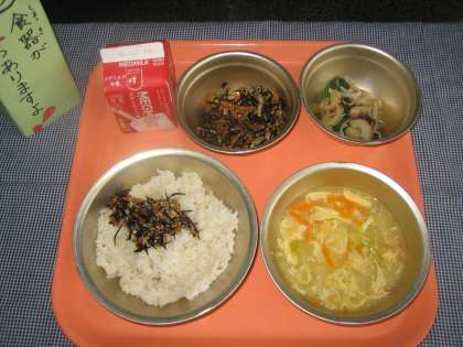 麦ごはん・牛乳・ひじきごはん(具)・伏見とうがらしとじゃこのいため煮・キャベツのかきたま汁