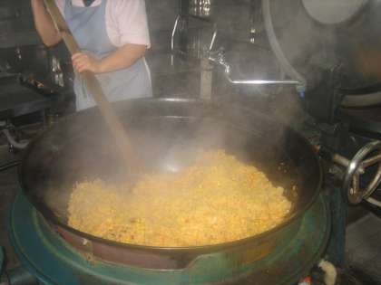 「カレーピラフ」は学校に保管していた米を使って給食室で炊きました。