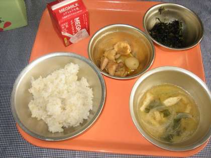 麦ごはん・牛乳・鶏肉のさっぱり煮・小松菜とひじきのいためもの・みそ汁