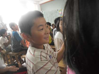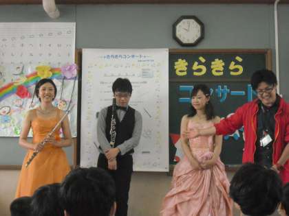 梅津北小学校でキラキラコンサートがありました。キラキラスターズのお兄さん、お姉さんが来てくださいました。フルートとピアノのきれいなお姉さんにうっとりするIさんでした。前に出て演奏するときはちゃっかりとフルートのお姉さんの横に立っていました。