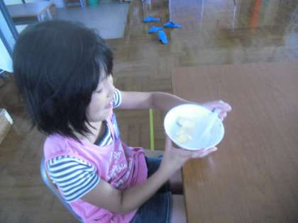 給食もしっかり食べたのですがポテトサラダもしっかりと!!畑のナスビも切って焼いて田楽にしました。Iさんはほんの一口二口だけ食べました。