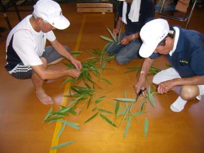 あいさつの後,笹船作りです。