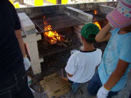 昼食のご飯を,みどりの広場のかまどで炊きます。火の元の枯れ木を集めて,火をおこしています。